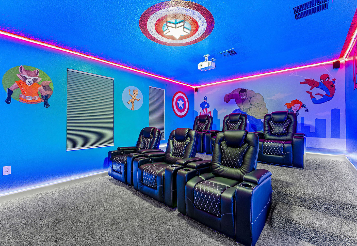 Discover magic at FrontLake Villa in Storey Lake Resort, just 7 miles from Disney! Enjoy our Star Wars game room, Princess and Lion King rooms, and an Avengers theater. After a day at the parks, unwind by the large pool and spa or enjoy a BBQ by the lake as you watch the Florida sunset.